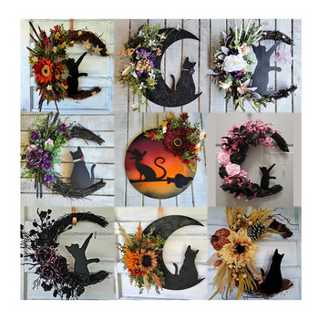 Bunga Buatan, Bunga Palsu, Hiasan Pintu Depan Menggantung Liburan Bulan Kucing Halloween Karangan Bunga